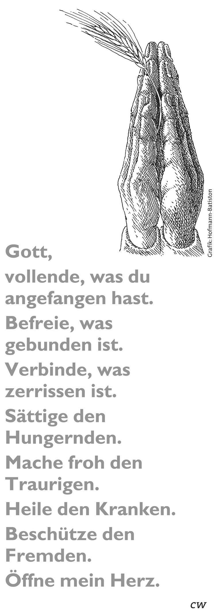 055_3404 20. März 2020 748 × 2133 055_3404 Gott, vollende, was du angefangen hast. Befreie, was gebunden ist. Verbinde, was zerrissen ist. Sättige den Hungernden. Mache froh den Traurigen. Heile den Kranken. Beschütze den Fremden. Öffne mein Herz. cw Grafik: Gemeindebrief