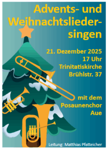 Hören und Singen Sa 21. Dezember | 17 Uhr Quelle: Martina Bocher Am 21.12 um 17 Uhr lädt der Posaunenchor Aue ein in die Trinitatiskirche Aue zu einem gemeinsamen Advents- und Weihnachtsliedersingen. Leitung: Matthias Pfatteicher Herzliche Einladung!